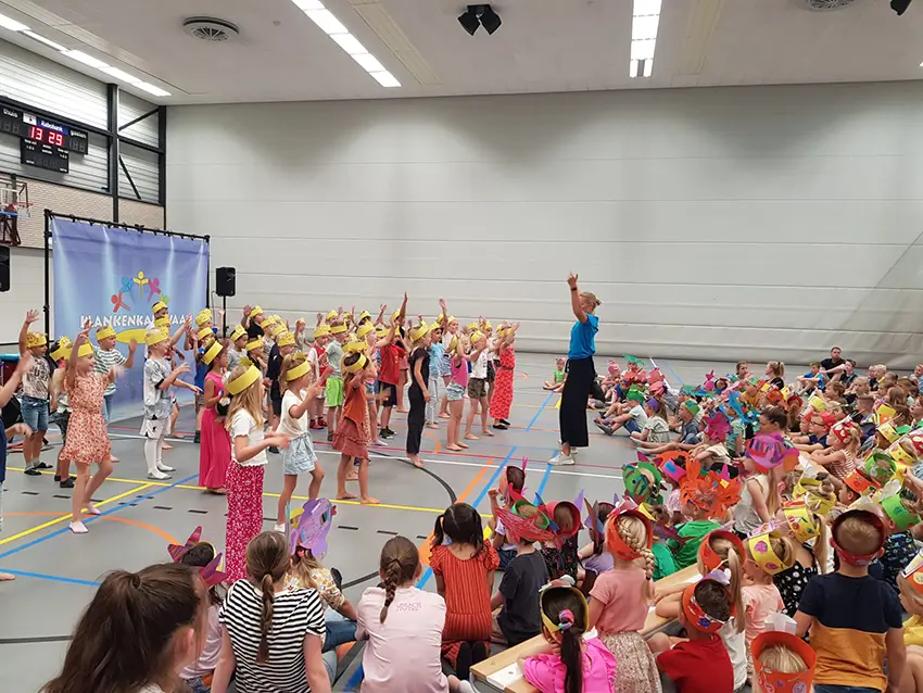 In één dag beleven de leerlingen van groep 1 t/m 8 een actieve en feestelijke voorstelling: