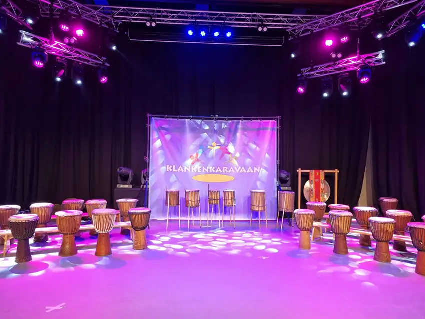 Voor de workshops is een leeg lokaal, speellokaal of gymzaal bijvoorbeeld heel geschikt. De voorstelling zelf kan op het plein of bijvoorbeeld in de gymzaal, kerk of zelfs theater!